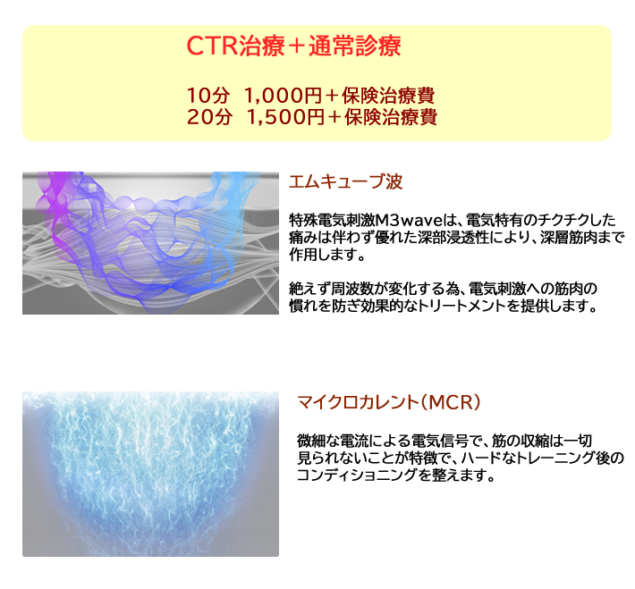 特殊な電気刺激(エムキューブ波)を利用したチクチクした痛みのない電気刺激の優れた深部浸透性により、筋肉や脂肪の厚みなどに左右されず、身体の深いところまで作用し、従来の電気治療器よりも、より効果的に疼痛緩和や筋肉のリラックス効果が期待出来ます。強い急性の腰痛や、神経痛、慢性的な筋肉の拘縮、姿勢改善など、さまざまな症状に対するアプローチが可能です。また、筋力トレーニングを目的としたアプローチも可能で、身体を動かしたりせず、少ない負担で筋力の向上・改善が見込めます。